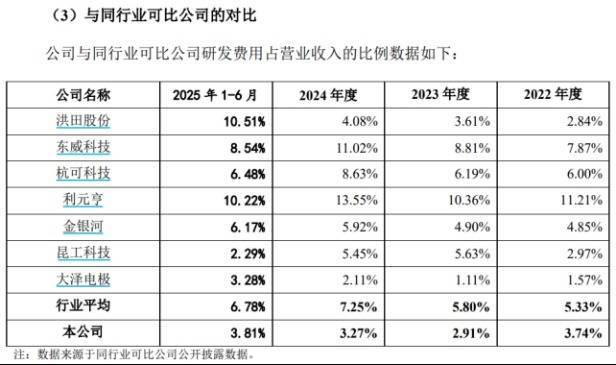 招股书显示,2022年至2024年,公司研发费用率分别为3.74%、2.91%、3.27%,持续低于同期同行业可比公司均值的5.33%、5.80%、7.25%。即便2025年上半年研发费用率提升至3.81%,仍低于同期行业平均水平的6.78%。不过公司认为,其司研发费用占营业收入的比例处于同行业可比公司范围之内,不存在较大差异。